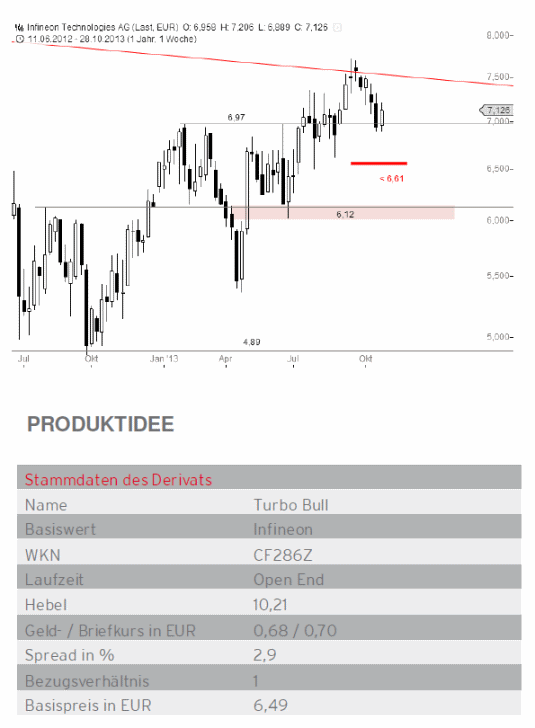 Interessierte Käufer in Infineon können die aktuelle Korrektur auf Wochenebene nutzen, um sich erneut auf der Käuferseite zu engagieren. Als Stopploss kämen beispielsweise 6,61 Euro in der Aktie in Frage.