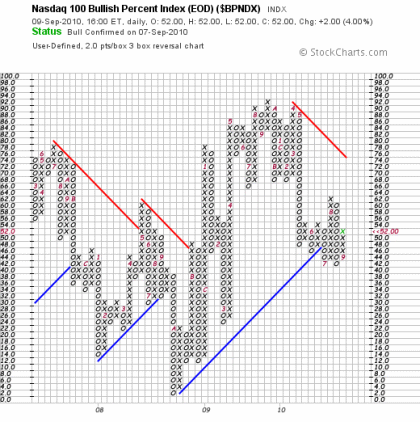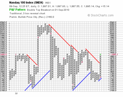 Gut erkennt man im P & F Chart den seit einem Jahr anhaltenden Seitwärtstrend, der speziell den trendfolgenden Anlegern das Leben schwer macht. Etwa zwischen 1.700 und 2.050 Punkten schwankten die Kurse. Nun kommt zum wiederholten Male Bewegung in die Sache und die sieht mir gar nicht nach „Double Dip“ aus. Denn sehr dynamisch übernahmen die Bullen Anfang September bei etwa 1.750 Punkten das Ruder in die Hand. Durch den Nachfrageüberschuss bildete sich eine lange positive X-Spalte und ein mehrfaches Kaufsignal. Dieses entsteht, wenn die aktuelle X-Spalte gleich mehrere vorhergehende X-Spalten übersteigt. Außerdem schoss die X-Säule gleich im ersten Anlauf über die seit April (Ziffer 4) etablierte fallende bärische Widerstandslinie, was als sehr bullish zu werten ist. Das Kursziel dieser Formation liegt bei etwa 2.150 Punkten und damit außerhalb der langwierigen Seitwärtsbewegung. Natürlich werden diese Kursziele üblicherweise nicht sehr schnell erreicht und dienen eher als Orientierungshilfe. Aber immerhin sinkt mit einem derartig positiven Kursziel die Gefahr von einem Konjunktureinbruch sehr stark. Unterstützung erhält die Nasdaq auch von der nach wie vor nur leicht erhitzten Markttechnik und den gleitenden Durchschnitten. Kürzlich hat der Index das Kunststück geschafft sowohl die 50- als auch die noch wichtigere 200-Tage-Linie von unten zu durchstoßen. Falls dies in den kommenden Tagen so bleibt, wäre ein sehr gefährlicher Baisse-Indikator vom Tisch.