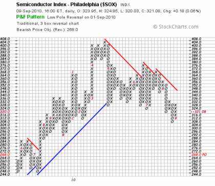 Nach der Gipfelbildung im April bei 400 Punkten bildete der Chipsektor ein sehr deutliches Verkaufssignal im Mai (Ziffer 5). Eine bärische Abwärtstrendgerade etablierte sich, die im Sommer mehrfach bestätigt wurde. Formal befindet sich der Sektor nach wie vor und objektiv auf „Verkauf“, es bildete sich aber eine derartiger Angebotsüberschuss in den vergangenen Wochen, die einem Sell-Off stark ähnelt und „Low-Pole“ genannt wird. Häufig ist danach der Markt bereinigt und auch diesmal könnte es so sein. Ich tippe darauf, dass der aktuelle (kurzfristige) Nachfrageüberschuss ein Kaufsignal bei 336 auslöst und die X-Spalte die vorhergehende übersteigt. Dies ist zwar meine subjektive Meinung, aber der innere Markt der Nasdaq und die weichende Volatilität aus den großen Indizes spricht dafür, dass sich auch die sehr wichtigen Chipwerte der freundlichen Tendenz nicht weiter entziehen und eine interessante Tradinggelegenheit darstellen könnten. Denn immerhin resultieren etwa 85 % der Kursbewegung einer Aktie aus dem Sektor und dem Gesamtmarkt. Deshalb sollten Sie das Eigenleben eines Sektors sehr genau untersuchen, bevor Sie in den Einzeltitel einer Branche investieren.