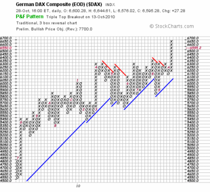 Deutlicher als die bekannteren Kerzencharts zeigt die von mir favorisierte P & F Technik den gelungenen Ausbruch des DAX. Die lange X-Spalte im rechten Bereich verdeutlicht das aktuelle Übergewicht der Käufer, signalisiert aber auch, dass eine Abkühlung keine besondere Überraschung sein sollte.