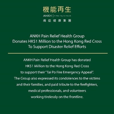 HONG KONG, Nov. 29, 2025 /PRNewswire/ -- In response to the devastating No. 5 alarm fire at Wang Fuk Court, Tai Po, ANKH Pain Relief Health Group has donated HK$1 million to the Hong Kong Red Cross to support their "Tai Po Fire Emergency Appeal".