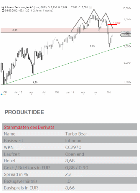 Eine Punktlandung hat die Infineon Aktie Mitte Oktober hingelegt, als die Kurse im Zuge ihres kurzfristigen Abwärtstrends bis auf die Unterstützung bei 6,90 Euro zurückfielen. Dort fanden sich ausreichend Käufer, um eine Gegenbewegung zu starten und mit dieser nähert sich die Aktie nun dem Widerstandsbereich um 8 Euro. Hier sind seit 2011 einige wichtige Hochs und Tiefs zu finden, sodass der Widerstand als relativ stark eingestuft werden muss. Erschwerend kommt hinzu, dass der Rückfall unter diese Preiszone im Oktober eine Toppformation in Form einer Schulter- Kopf-Schulter vollendete. Genau dieses Verkaufssignal wird aktuell von unten im Rahmen eines klassischen Pullbacks getestet.