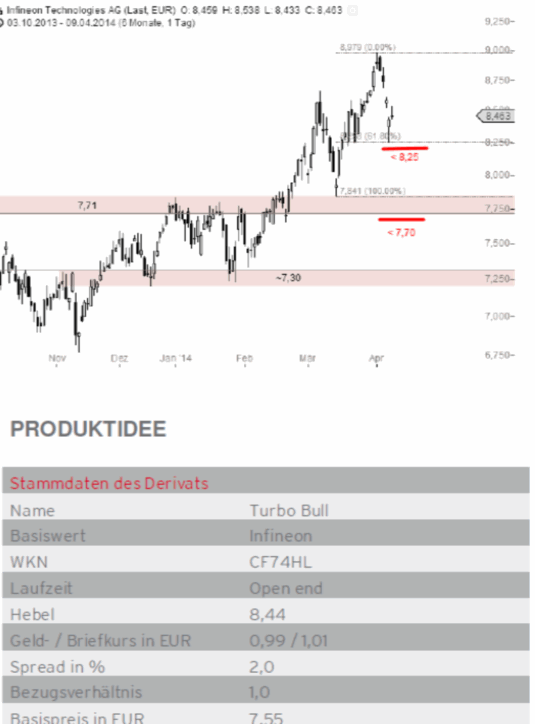 Steigt Infineon heute über 8,55 Euro an, können aktive Trader auf eine weitere Kaufwelle spekulieren. Eine Stoppabsicherung wäre aggressiv bei 8,25 und defensiv bei 7,70 Euro möglich.