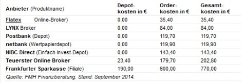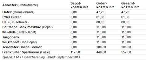 Wie weit Filialbanken und Onlinebroker mittlerweile auseinanderliegen, zeigt der FMH-Vergleich. Ein Kunde, der im Jahr sechs Orders für 10.000 Euro abgibt und Papiere mit einem Wert von 120.000 Euro verwalten lässt, zahlt beim Onlinebroker Flatex rund 35 Euro. Beim teuersten Onlinebroker werden mehr als 200 Euro fällig. Eine klassische Filialbank, in diesem Falle ist das beispielhaft die Frankfurter Sparkasse, berechnet laut FMH 770 Euro.