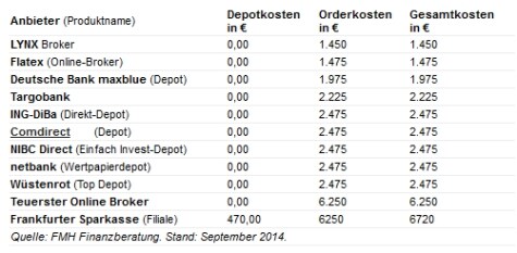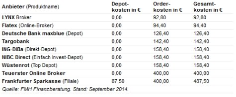 Für Handelsblatt Online hat ein Team der FMH die Kosten für vier Musterkunden bei 17 Onlinebrokern verglichen. Ganz ohne Wechselprämien liegt die Ersparnis je nach Fall zwischen knapp 400 Euro und 5.270 Euro pro Jahr. In einem Fall würde der Kunde bei seiner Sparkasse mehr als 20-mal mehr zahlen als beim günstigsten Onlinebroker. Das Sparpotenzial beim Wechsel der Depotbank - von Bankfiliale zu einem Onlinebroker - ist demnach enorm.