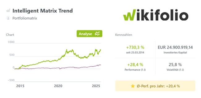 Christian Jagd setzt mit seinem wikifolio Intelligent Matrix Trend auf ein breites Anlageuniversum und kombiniert klassische Fundamentalanalyse mit ausgefeilter Charttechnik. Er möchte globale Chancen frühzeitig erkennen und in aussichtsreiche Einzelwerte investieren - bevorzugt in Aktien, die sich in stabilen Aufwärtstrends oder kurz vor einem technischen Ausbruch befinden. Unterstützt wird die Analyse durch ein eigens entwickeltes Excel-/VBA-Handelstool mit Realtime-Anbindung und Signalgebung, das auf Indikatoren wie RSI und stochastische Oszillatoren zurückgreift. Neben internationalen Blue Chips werden bewusst auch dynamische Nebenwerte sowie Wachstumsunternehmen aus der Tech-Branche ins Auge gefasst. Long- und Short-ETFs ermöglichen es, sich an jede Marktphase anzupassen. Hervorzuheben ist das aktive Risikomanagement: Schwankungen werden hier nicht ignoriert, sondern aktiv begleitet. So entsteht ein Portfolio, das fundierte Selektion mit taktischer Beweglichkeit verbindet. Knapp zwei Drittel des wikifolios machen 39 Einzelaktien aus. Größte Positionen sind dabei Nvidia, American Superconductor, Robinhood Markets, BioNTech und TransMedics Group. Knapp 30 % wurden in 18 ETFs angelegt, die mitunter sehr Bitcoin- und Digital-lastig sind. Jagd verfügt im Moment über 6,4 % Cash in seiner Kriegskasse. Er hat seit dem Start im März 2014 eine durchschnittliche Jahresrendite von grandiosen +20,4 % erzielt und damit ein Gesamtplus von +730 % erwirtschaftet.
