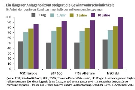 Kauft ein Investor an einem beliebigen Tag eine Aktie, so hat er eine Chance von etwas mehr als 50 Prozent, dass diese schon am nächsten Tag steigt. Erweitert der Anleger seine Haltedauer jedoch von einem Tag auf ein Jahr, erhöht sich die Wahrscheinlichkeit einen Gewinn zu erzielen von 50 auf über 70 Prozent. Bei einem Anlagehorizont von zehn Jahren beträgt die Gewinnwahrscheinlichkeit für europäische Aktienwerte 85 Prozent. Investiert der Anleger in US-amerikanische oder britische Titel erreicht seine Gewinnwahrscheinlichkeit bei einer zehnjährigen Haltedauer sogar über 90 Prozent.