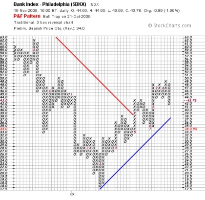 Speziell wenn von außen keine substanziell neuen Nachrichten auf einen gesättigten Markt treffen, lohnt es sich den inneren Markt zu analysieren. Schnell wird deutlich, dass momentan der breite Aktienmarkt unter leichten Kapitalabflüssen leidet, während nur sehr wenige hoch kapitalisierte Werte den Dow Jones Index oben halten. Dies ist natürlich kein gutes Zeichen und sollte unbedingt beachtet werden. Vor allem vor dem Hintergrund, dass immer mehr wichtige Industriesektoren Verkaufssignale bilden, bzw. an relativer Stärke verlieren. Exemplarisch nenne ich hier den wegen seiner für den Gesamtmarkt großen Bedeutung angeschlagenen US-Bankensektor, der nach seiner starken Rallye jetzt sehr zerklüftet ist. Immerhin haben 11 Banktitel jüngst ein neues Hoch und 10 ein neues Jahrestief markiert. Man ist hier also derzeit mit relativ hohem Risiko investiert, da der Sektor volatil ist und sich der größte Teil des Risikos einer Aktie im Sektor und nicht im Einzeltitel verbirgt. Das Dilemma der Banken zeigt aber auch der Chart, der ein deutliches technisches Warnsignal in Form einer Bullenfalle gegeben hat.