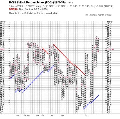 Das von mir hier schon mehrfach angesprochene „Bullish Percent-Konzept“ ist ein Risiko-Parameter, welches die Zustände eines Marktes in verschiedene Gefahrenbereiche differenziert. Es handelt sich hierbei auf keinen Fall um ein Timinginstrument, sondern um einen Gradmesser für das Risiko von Aktienengagements. Dieser Indikator ist so wichtig, da er Ihnen den „inneren“ Zustand des Marktes oder eines Sektors verrät. Marktzustände oberhalb von 70% sind überkauft und mit Vorsicht zu genießen, obwohl gerade dann die Mehrheit der Kommentatoren euphorisch wird. Bildet sich aber in diesem Bereich, wie aktuell, eine O-Spalte, ist mit Verlusten zu rechnen, die über das Maß von Gewinnmitnahmen hinausgehen . Mindestens 6 % aller Werte müssen ein objektives Verkaufssignal ausbilden, um eine neue O-Spalte zu eröffnen. In anderen Worten könnte man auch sagen, der BPI zeigt, wie viele Prozent der Aktien eine Hausse oder Baisse mittragen.