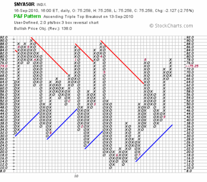 Spannend ist die aktuelle Ausgangslage außerdem, da sich der Index nun bei knapp 1.130 Punkten exakt auf dem Niveau befindet, auf welchem er im Sommer mehrfach scheiterte. Da die allgemeine Markttechnik heute nicht überkauft und die Mehrheit der Anleger recht skeptisch ist, schätze ich die Chance für die Überwindung des Widerstands als gut ein. Von großer Bedeutung sind für mich natürlich auch die Signale der P & F Technik. Der übergeordnete Aufwärtstrend anhand der steigenden positiven Unterstützungsgeraden bleibt natürlich intakt. Sehr häufig enden größere Konsolidierungen in der Nähe dieser Trendgeraden, vielleicht auch diesmal wieder. Dies deutet auch das objektive Kaufsignal der P & F Technik an, denn die aktuelle X-Säule übersteigt die vorhergehende deutlich. Die Nachfrage übersteigt also das Angebot und frisches Kapital fließt wieder in den Markt. Das Projektionsziel der P & F Technik, welches die Schwungkraft der Kursbewegung misst, deutet darauf, dass die zyklischen Hochs am US-Aktienmarkt überwunden werden. Auch der innere Markt, auf den ich mir hier öfters beziehe, steht wieder in einer positiven X-Spalte und zeigt die Zuflüsse in den breiten Markt der NYSE. Man kann also davon ausgehen, dass die Bullen wieder am Ball sind und die offensive Mannschaft auf dem Feld bleiben darf.