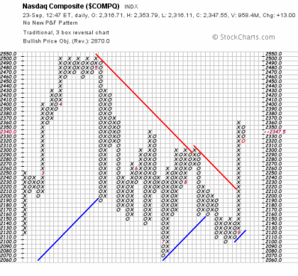 Wie Sie gut an der rechten X-Spalte erkennen, sind die Bullen grundsätzlich im Vorteil, obwohl sich aktuell eine negative 0-Spalte bildet. Bereits in den ersten Septembertagen (Ziffer 9) wurde der seit Mai dominierende Abwärtstrend nachhaltig geknackt. Küezlich fiel auch der Widerstand des Zwischenhochs bei 2.340 Punkten. Auf diesem Niveau wurde die Bodenbildung vollendet und das nächste Kursziel befindet sich nach konservativer Betrachtung bei 2.500 Punkten, wo die Kurse im Mai ein wichtiges Hoch markierten, dann unter hohem Volumen in die Knie gingen. Die im September begonnene X-Spalte ist sehr dynamisch und deutet daher auf ein Umdenken der Marktteilnehmer, bzw. auf starkes Kaufinteresse. Immerhin signalisiert die Projektionsmethode der P & F Technik nach dem mehrfachen Kaufsignal und der Länge der X-Spalte zu urteilen auf ein mittelfristiges Kursziel von über 2.850 Punkten. Man darf also gespannt sein, ob der September wirklich den Ansprüchen der Bären gerecht wird. Bisher sieht es nicht danach aus, obwohl sich jüngst eine 0-Spalte gebildet hat. Bisher ist diese nur eine gesunde Gegenreaktion der Bären und es wäre keineswegs beunruhigend für die Bullen, falls die 0-Spalte bis in die Gegend von 2.230 Punkten hinunterreichen würde.
