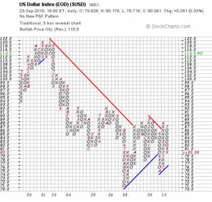 Im Frühjahr dieses Jahres versuchte der Dollar den Rückenwind der Währungskrise zu nutzen und nach oben auszubrechen. Dies misslang und im Juli (Ziffer 7) bildete sich eine erneute 0-Spalte und erhöhter Verkaufsdruck drückte den Index wieder unter die zuvor geknackte bärische Widerstandslinie. Damit bildete sich eine klassische Bullenfalle im Dollar und nun scheinen die Höhenflüge der US-Währung fürs Erste beendet zu sein. Die Anleger erkennen, dass der Dollar nicht zu einer Hartwährung wird, „nur“ weil auch Südeuropa ein Verschuldungsproblem hat. Noch bedeutender für die Dollarschwäche ist aber die Tatsache, dass der berühmte Carry-Trade gegen den Yen wird, da der Zinsunterschied zwischen amerikanischen und japanischen Anleihen nur noch marginal ist, die Kursrisiken aber bestehen bleiben. Es fließt weniger spekulatives Geld in den Dollarraum zurück. Dies schwächt tendenziell die Währung und kommt der US-Administration sehr gelegen. Wegen des abflauenden Carry-Trades sollten sowohl der Edelmetallsektor als auch Rohstoffe interessant für Anleger bleiben. Denn obwohl die Rentenmärkte nach wie vor viel Geld anziehen, steigt das Bedürfnis der Investoren, Teile des Vermögens in Sachwerte wie Aktien und Edelmetalle zu schichten. Aus diesem Grunde bleibe ich für Aktien strategisch vorsichtig optimistisch.