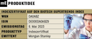 Anleger, die gleich auf mehrere vielversprechende Unternehmen aus dem Bereich Biotechnologie setzen möchten, schauen sich das Indexzertifikat auf den Biotech Supertrends Index (WKN: DA0ABZ / ISIN: DE000DA0ABZ9) anschauen.
