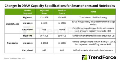 TAIPEI, Dec. 11, 2025 /PRNewswire/ -- TrendForce's latest investigations reveal that memory prices are projected to rise sharply again in the first quarter of 2026, exerting significant cost pressure on global end-device manufacturers. Consequently, smartphone and notebook brands are compelled to increase their product prices and reduce specifications. A further downward revision of shipment forecasts now seems unavoidable, with market resources becoming more concentrated among a few leading brands.