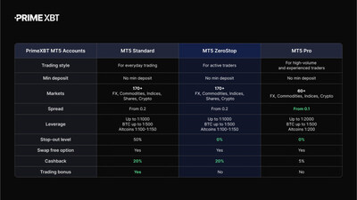 CASTRIES, Saint Lucia, Oct. 21, 2025 /PRNewswire/ -- PrimeXBT, a global multi-asset broker, has introduced the ZeroStop account on MetaTrader 5, expanding its MT5 lineup to three account types: Standard, ZeroStop, and Pro.