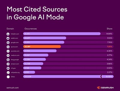 View original content to download multimedia:https://www.prnewswire.com/news-releases/quora-ranks-among-top-cited-sources-in-googles-ai-mode-responses-according-to-semrush-302573107.html