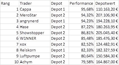 "Zenturio" schob sich vom fünften auf den zweiten Rang und hat 268.929 EUR in seinem Depot. Wie "Null" setzt er seit dem 15. September gehebelt auf einen fallenden DAX, zeigte sich jedoch daneben recht aktiv im Bereich des Aktien-Trading. Aktuell hält er eine Reihe kleinerer Werte aus dem HealthCare-Sektor in seinem Depot, die allerdings derzeit überwiegend im Minus notieren. Der Teilnehmer "Sandra" rangiert dich dahinter auf dem dritten Rang mit 267.509 EUR.