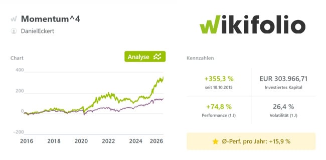 Einen vollkommen anderen, primär technisch orientierten Weg verfolgt Daniel Eckert mit seinem wikifolio Momentum^4. Momentum ist ein bewährtes Konzept, von dessen Vorteilen auch "bekannte Wissenschaftler" überzeugt sind, wie Eckert in seiner kurzen Handelsidee ausführt. Tatsächlich gibt es zahlreiche Studien zu Überrenditen durch Momentumseffekte. Bleibt also noch zu klären, was es mit "^4" auf sich hat. Dies ist nicht etwa eine kryptische Formel, mit der das Momentum noch einmal gehebelt werden soll, sondern ein Verweis auf die Rückschauperiode, die bis zu vier Quartale betragen kann. Tatsächlich liegt die eigentliche Kunst beim Momentum-Investing darin, zwischen echtem und damit tragfähigem Momentum und solchen Aktien zu unterscheiden, die einfach nur kurzfristig übergekauft sind. Eckert darf man hier einiges an Expertise zutrauen, hat er sich doch das Thema "Rationales Investieren" auf die Fahne geschrieben. Das unterstreicht er auch mit seinem Daytime-Job, in dem er sich wissenschaftlich mit dem Thema auseinandersetzt. Im wikifolio wendet er seine Expertise vorzugsweise auf das Universum deutscher Aktien an. Aktuell hält er 36 Einzeltitel und ist damit praktisch voll investiert. Wie gut diese rein technische Methode funktioniert, zeigt die Historie. Denn Eckert startete bereits am 18.10.2015, also vor mehr als zehn Jahren, und konnte seitdem eine jährliche Durchschnittsrendite von +15,9 % erwirtschaften. Den Vogel schoss er allerdings in den letzten zwölf Monaten ab. Hier stehen atemberaubende +74,7 % auf der Uhr. Alles in allem ergibt dies eine sehr erfreuliche Gesamtperformance von +355 %.