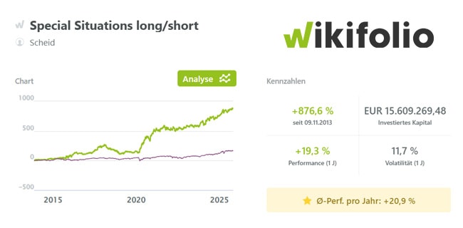 Erfolgstrader Christian Scheid verfolgt mit seinem wikifolio Special Situations long/short eine anspruchsvolle Event-Driven-Strategie mit Fokus auf deutsche Nebenwerte. Er begibt sich auf die Suche nach Sondersituationen, also jenen Momenten, in denen sich Unternehmen abseits der allgemeinen Marktentwicklung stark verändern. Ob Übernahmegerüchte, Squeeze-outs, Sonderdividenden oder rechtliche Entscheidungen - all das sind Ereignisse, die neue Bewertungen auslösen können. Es werden sowohl Long- als auch Short-Positionen eingegangen, um Chancen in verschiedenen Marktphasen zu nutzen. Dabei kommen vereinzelt Hebelprodukte zum Einsatz, jedoch stets mit striktem Risikomanagement. Ziel ist eine positive Rendite unabhängig von der allgemeinen Marktrichtung - also echtes Alpha, statt bloßem Beta. Das Konzept überzeugt durch seine klare Struktur, den Fokus auf Ereignisse mit Substanz und den Mut, auch gegen den Strom zu denken - eine seltene Kombination unter Anlegern. Scheid hält aktuell fast 50% in Cash und wartet auf die ersten Anzeichen der Jahresendrally. Der Rest seines Kapitals steckt in 21 Einzelaktien. Außer bei Nebenwerten wie Ströer, Dermapharm Holding und Hugo Boss engagiert er sich auch bei dem einen oder anderen Schwergewicht wie Commerzbank und Barrick Mining. Seit der Auflegung im November 2013 hat er eine beeindruckende durchschnittliche Jahresperformance von +20,9 % erzielt, was zu einem Wertzuwachs von +877 % geführt hat.