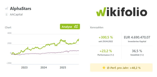 Einen konsequent datengetriebenen Ansatz fährt Michael Bichlmeier mit dem wikifolio AlphaStars. Fundamentale Kennzahlen wie KGV und KCV bilden dabei die Grundlage, ergänzt durch technische Indikatoren wie Trend und Momentum. Emotionen, Meinungen oder Marktgeräusche blendet er so gut wie möglich aus - Entscheidungen sollen ausschließlich auf Basis messbarer Fakten getroffen werden. Das Vorhaben ist ambitioniert: eine nachhaltige Outperformance gegenüber dem MSCI World bei moderatem Risiko. Charakteristisch ist die systematische Analyse mit klarem und akribisch betriebenem Risiko-Management. In Phasen erhöhter Unsicherheit kann das Portfolio vollständig in Cash oder defensive Absicherungen wechseln - etwa ETFs und Short-Produkte. Dadurch bleibt das Kapital flexibel und geschützt, bis sich neue Chancen bieten. Bichlmeier hält seine Engagements in der Regel zwischen drei und sechs Monaten, nur in Ausnahmefällen trennt er sich schon vorher. Stand heute ist er vollinvestiert und managt 36 Einzelwerte mit einer deutlichen Gewichtung auf US-Unternehmen wie Tesla, Apple, Micron Technology, Western Digital und Advanced Micro Devices. So legte der Wert des wikifolios im Jahresdurchschnitt um atemberaubende +48,2 % zu. Die Gesamtrendite seit April 2022 beläuft sich auf glatte +300 %.