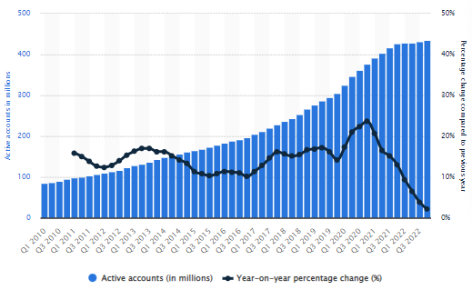 Die Anzahl der aktiven PayPal-Nutzer (Stand Q3 2023) hat sich seit 2017 um mehr als 100% erhöht. Die Entwicklung mit immer niedrigerem jĂ€hrlichen Wachstum ist jedoch besorgniserregend. Andererseits ist dies indirekt auf die Skaleneffekte zurĂŒckzufĂŒhren: Mit 430 Millionen Nutzern ist es fĂŒr das Unternehmen schwieriger, im gleichen Tempo wie zu der Zeit, als es 200 Millionen Nutzer gab, zu wachsen. Quelle: Statista
