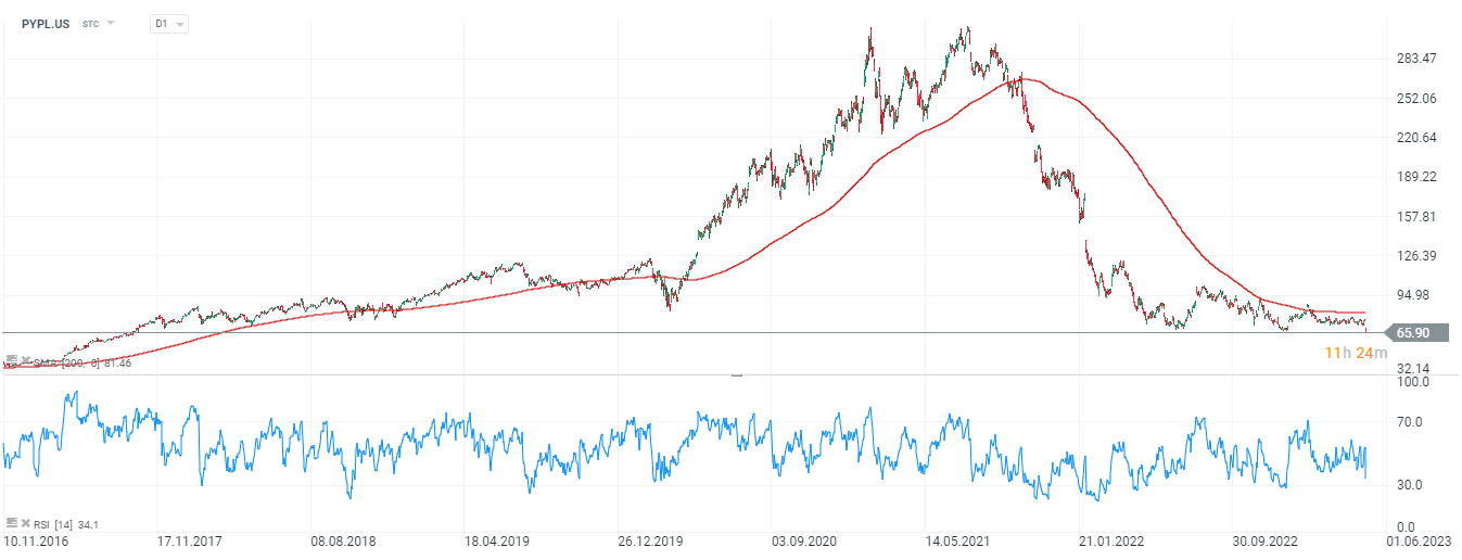 PayPal-Aktien (PYPL.US) im W1-Chart. Das Unternehmen setzt den Ausverkauf fort, der bereits nahe an den Niveaus von Oktober 2017 liegt. Im November 2021 fiel der Preis unter den SMA200 und signalisierte eine SchwĂ€che, die den Aktienkurs des Unternehmens noch nie in einem solchen AusmaĂ getroffen hat. Der Druck drĂ€ngte die Bullen zweimal vom SMA200 ab, einschlieĂlich im Herbst 2022 und im Februar 2023. Der entscheidende Widerstand scheint bei 81 US-Dollar zu liegen, wo der SMA200 verlĂ€uft. Ein Indikator, der fĂŒr aggressive Anleger auf "attraktiven Schwung" hinweisen kann - das PEG-VerhĂ€ltnis, das von Peter Lynch popularisiert wurde, ist auf 1,09 gefallen und liegt nahe an historischen TiefstĂ€nden. Quelle: xStation5 von XTB