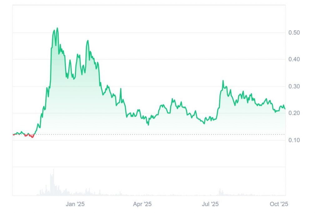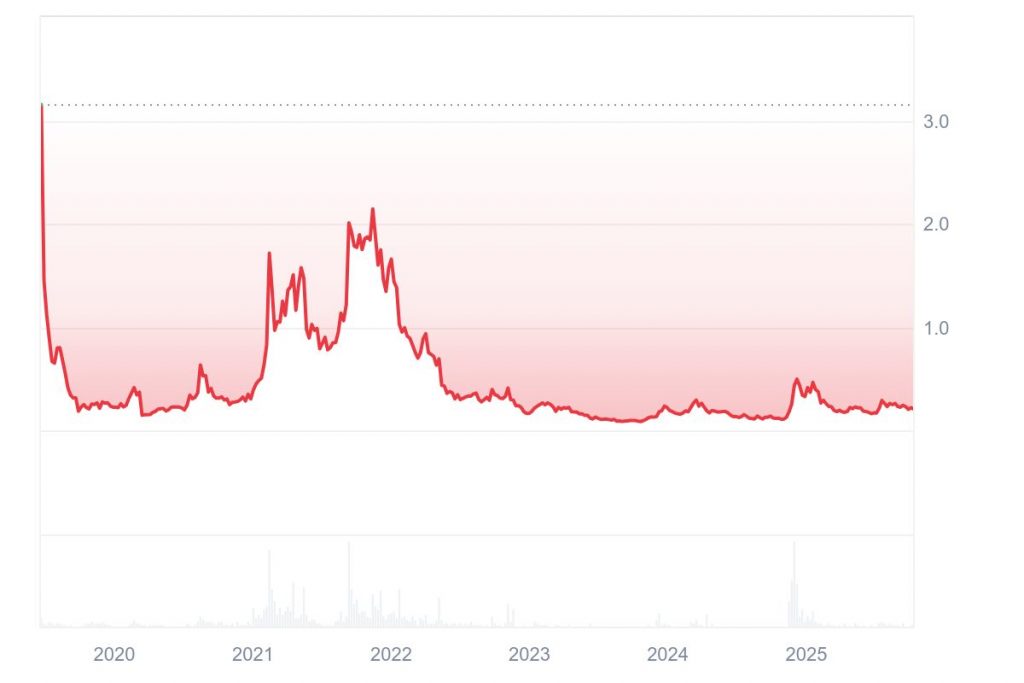 In den letzten Jahren kam es zwischenzeitlich zu Kursrückgängen auf bis zu 0,10 $. Im Verlauf der letzten 12 Monate ging es Ende 2024 zumindest wieder auf 0,50 $ aufwärts. Seitdem hat das Momentum von ALGO jedoch erneut stark nachgelassen, und momentan wird der Coin unmittelbar über dem wichtigen 0,20-$-Support gehandelt. Aktuell liegt die Marktkapitalisierung bei 1,88 Milliarden $, und das Handelsvolumen ist mit weniger als 100 Millionen $ in den letzten 24 Stunden eher gering.