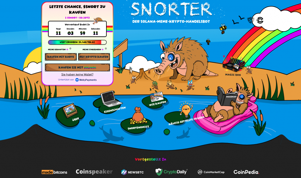 Der Coin befindet sich dementsprechend noch in der frühestmöglichen Entwicklungsphase, und der Einstieg ist zu einem rabattierten Festpreis von 0,1073 $ über die offizielle Website des dahinterstehenden Projekts Snorter möglich. Auf diesem Weg sind bis heute bereits über 4,4 Millionen $ an Presale-Funding zusammengekommen. Die im Vorverkauf erworbenen Coins können zudem für eine jährliche Rendite von bis zu 112 % gestakt werden. Der Kauf ist sowohl mit Bankkarte als auch mit etablierten Kryptowährungen möglich.
