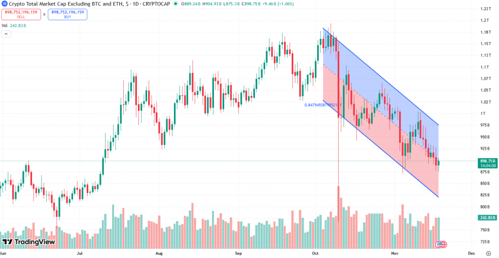 Total 3, also die Marktkapitalisierung ohne Bitcoin und Ethereum, zeigt ein angeschlagenes Bild. Die vorherige bullische Flagge war nach unten gebrochen worden. Der ehemalige Support wird nun von unten als Widerstand getestet. Aus technischer Sicht spricht das eher für einen überfälligen Rücklauf innerhalb eines Abwärtstrends als für den Start einer neuen Altcoin Welle.