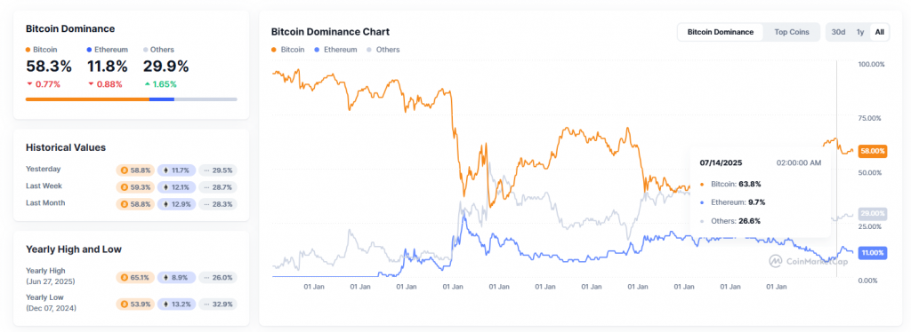 Im Juli war die Bitcoin Dominanz noch bei 64 Prozent, jetzt nur mehr 58,3 Prozent, Quelle: www.coiunmarketcap.com