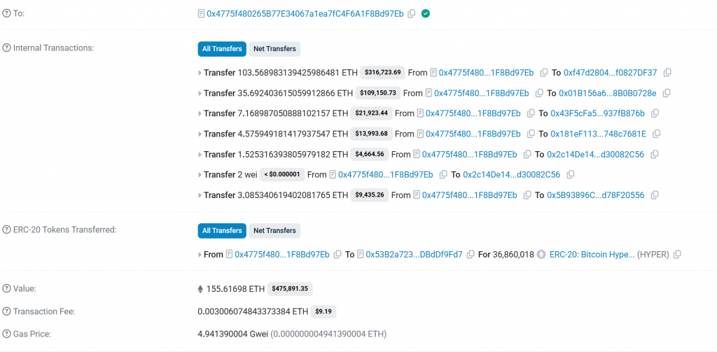 Bitcoin Hyper Kauf für 155,6 ETH, Quelle: https://etherscan.io/tx/