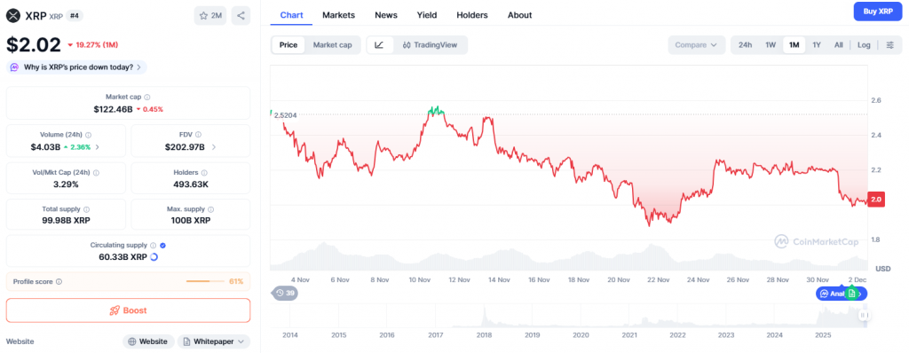 XRP Chart zeigt sich schwach, Quelle: www.coinmarketcap.com