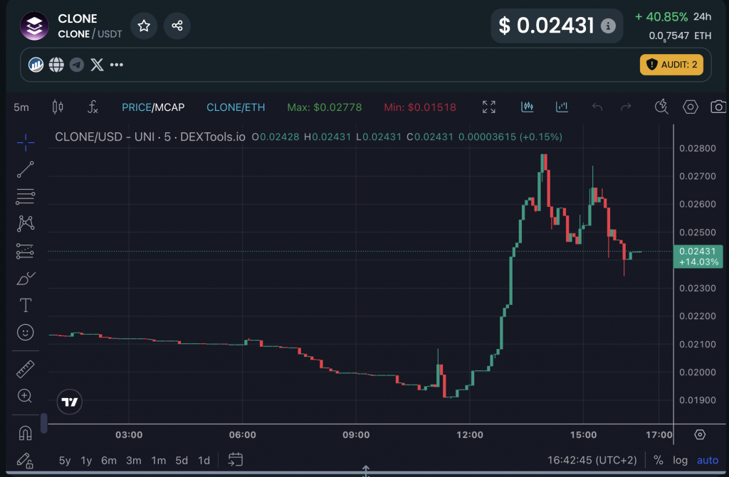 Tate argumentiert, dass Regierungen und KI-Systeme künftig in der Lage sein werden, Wallets zu analysieren, Besitzverhältnisse offenzulegen und Vermögen gezielt zu blockieren. Genau hier setzen Privacy Coins an, denn sie verschleiern On-Chain-Daten und bieten Nutzern ein höheres Maß an finanzieller Privatsphäre. Statt Zcash empfiehlt Tate jedoch den neuen $CLONE-Token, der auf der Confidential Layer-Technologie basiert. Seine Empfehlung wird auch bereits angenommen und der CLONE-Kurs ist in den letzten 24 Stunden um über 40 % gestiegen.