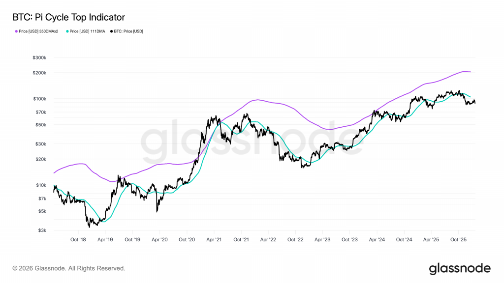 Der Pi Cycle Top Indicator ist ein spezieller On-Chain-Indikator, der entwickelt wurde, um mögliche Zyklushochs bei Bitcoin zu identifizieren. Er vergleicht dazu zwei gleitende Durchschnitte: den 111-Tage-Durchschnitt des Bitcoin-Preises und das Zweifache des 350-Tage-Durchschnitts. In der Vergangenheit zeigte sich, dass große Markttops oft dann entstanden, wenn sich diese beiden Linien kreuzten oder sehr nahe kamen. Der Indikator dient also weniger dazu, Tiefpunkte zu finden, sondern vielmehr dazu, Überhitzungsphasen und mögliche Zyklusenden frühzeitig sichtbar zu machen.