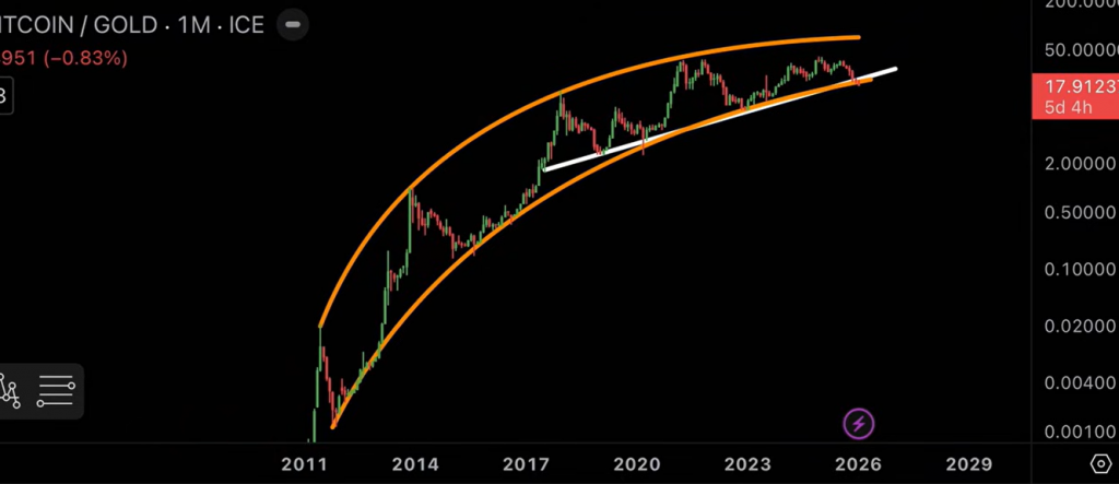 Der Blick auf den Bitcoin-Chart sorgt derzeit für Unruhe. Nicht wegen des US-Dollar-Kurses, sondern wegen eines Vergleichs, der seltener gezeigt wird. Bitcoin gemessen in Gold. Genauer gesagt: ein Bitcoin im Verhältnis zu einer Feinunze Gold. Genau dieser Chart sendet erstmals seit Jahren ein Warnsignal.