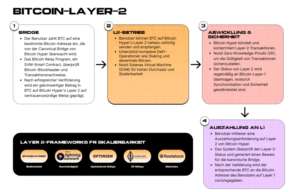 Genau an diesem Punkt setzt Bitcoin Hyper an. Das Projekt erweitert Bitcoin um eine Layer-2-Struktur auf Basis der Solana Virtual Machine. Transaktionen laufen dabei nicht direkt auf der Hauptchain, sondern in einer schnellen Ausführungsschicht mit sehr geringen Gebühren. Bitcoin selbst bleibt die Abwicklungsebene für den finalen Ausgleich.