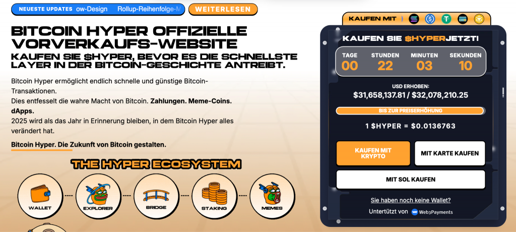 Der Hyper Token übernimmt innerhalb dieses Systems eine zentrale Rolle. Er dient als Transaktions-Token, ermöglicht Staking und soll künftig Governance-Prozesse im Netzwerk steuern. Aktuell befindet sich der Token noch im Presale. Laut Projektangaben wurden bereits über 31 Millionen US-Dollar investiert. Frühzeitige Investoren können damit zu einem festen Vorverkaufspreis einsteigen, bevor eine mögliche Börsennotierung erfolgt.