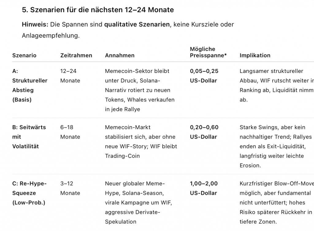 Die KI ordnet WIF deshalb im klassischen Verlauf eines Meme-Zyklus ein: vom Hype zur Distribution, anschließend in die Post-Blasen-Phase. Besonders auffällig: Die Markenwirkung sei „erkennbar abgeflacht“, während neue Solana-Memes das kulturelle Momentum übernehmen. WIF wirke nicht mehr wie ein Trendsetter, sondern wie ein Überbleibsel eines vergangenen Narrativs.
