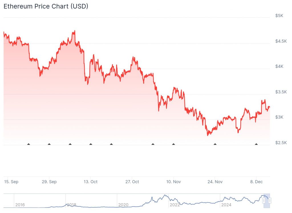 Diese Korrektur drückte den Preis von ETH schließlich sogar unter 3.000 $. Am 21. November fiel ETH so wieder auf ein Low von 2.695 $ zurück, was den tiefsten Kursstand seit Juli dieses Jahres darstellt. Nach diesem heftigen Crash von fast 50 % vom Allzeithoch stiegen jedoch wieder mehr Anleger ein, und es kam zu einer erhöhten Nachfrage. Den Käufern gelang es dadurch, den Preis schnell wieder über die psychologisch hochrelevante 3.000-$-Marke zu drücken.