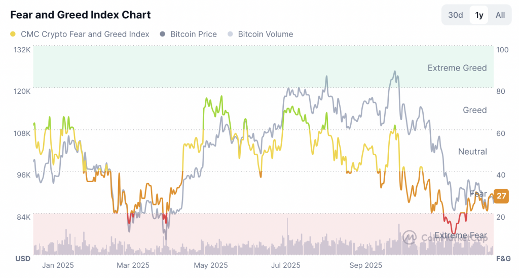 Auch das allgemeine Marktsentiment bleibt angespannt. Der Fear-and-Greed-Index liegt mit einem Wert von 27 weiterhin im Panikbereich, wenngleich er sich von seinem jüngsten Extremwert bei 11 etwas erholt hat. Die Zinssenkung der US-Notenbank brachte bislang keine nachhaltige Stimmungswende, was zeigt, wie fragil das Vertrauen der Marktteilnehmer derzeit ist.