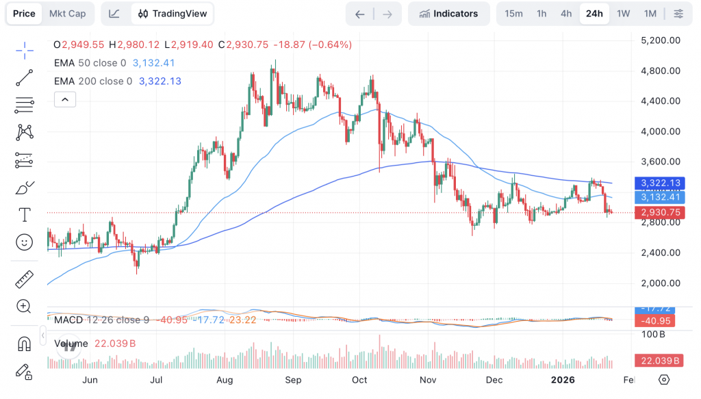 Ein Blick auf den Tageschart zeigt, warum viele Anleger derzeit frustriert sind. Ethereum notiert unter dem EMA50 und dem EMA200, was aus technischer Sicht für einen anhaltenden Abwärtstrend spricht. Seit dem Hoch im Spätsommer hat ETH einen großen Teil seiner Gewinne wieder abgegeben und bewegt sich aktuell in einer breiten Seitwärtszone rund um den Bereich von 2.800 bis 3.200 Dollar.