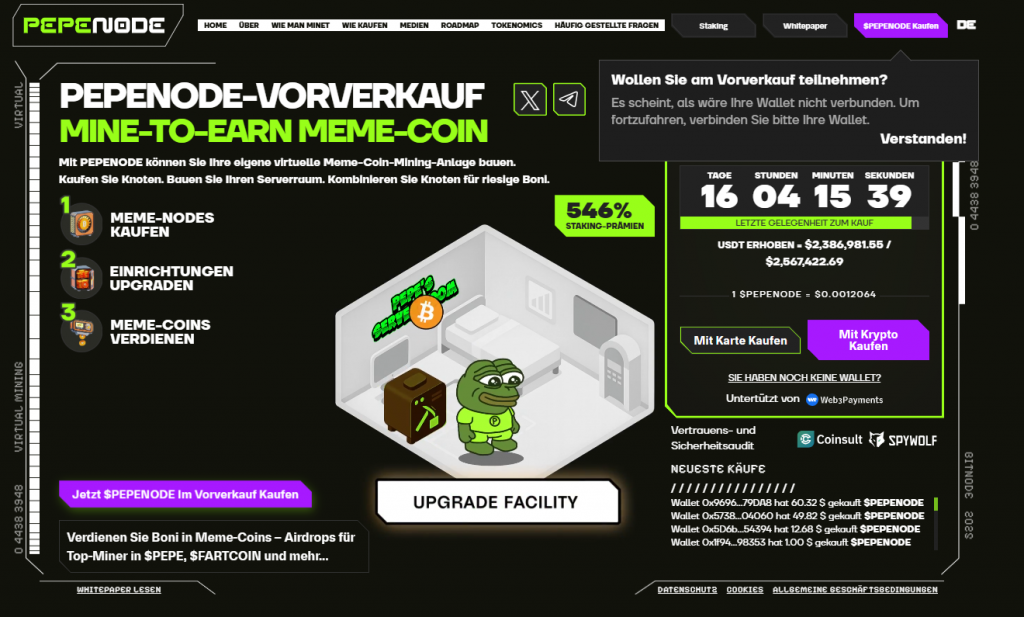 Gerade in schwachen Marktphasen zeigt sich, ob solche Modelle tragen. Projekte, die nicht auf ständigen Zufluss neuer Käufer angewiesen sind, sondern auf Nutzung und In-Game-Logik setzen, hatten in der Vergangenheit diese Memecoins deutlich bessere Überlebenschancen. Der aktuelle Presale-Preis von PEPENODE liegt bei 0,0012064 US-Dollar. Noch rund 16 Tage bleiben bis zum Ende der aktuellen Phase, bevor der Übergang in eine marktabhängige Preisfindung erfolgt.