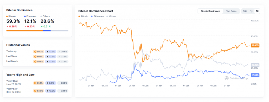 Auch die Bitcoin-Dominanz liefert derzeit keine klaren Hinweise. Mit rund 60 Prozent hält sich die Kennzahl seit Tagen auf nahezu identischem Niveau. Ein nachhaltiger Ausbruch über 60,5 Prozent würde Altcoins kurzfristig weiter schwächen, während ein Rücksetzer unter 59,5 Prozent als erstes Signal für ein Wiederaufleben des Altcoin-Marktes gelten könnte. Besonders relevant bleibt die Marke bei 58,3 Prozent, sie diente schon mehrfach als Wendepunkt in vergangenen Marktphasen.