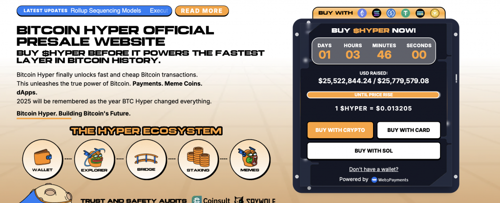 Der native Token $HYPER ist aktuell noch im Vorverkauf erhältlich und schon jetzt explodiert die Nachfrage. In kurzer Zeit haben Anleger Token im Wert von über 25 Millionen Dollar gekauft, weshalb erwartet wird, dass $HYPER einer der vielversprechendsten Altcoins in diesem Jahr werden könnte. Vor allem wenn sich die Layer 2 als Standardlösung für Bitcoin DeFi-Anwendungen durchsetzt, ist das Potenzial enorm. Kurssteigerungen um das 20- bis 30-fache wären dabei keine große Überraschung. Allerdings dürfte es nicht mehr lange dauern, bis der Vorverkauf endet und $HYPER an den Kryptobörsen gelistet wird.