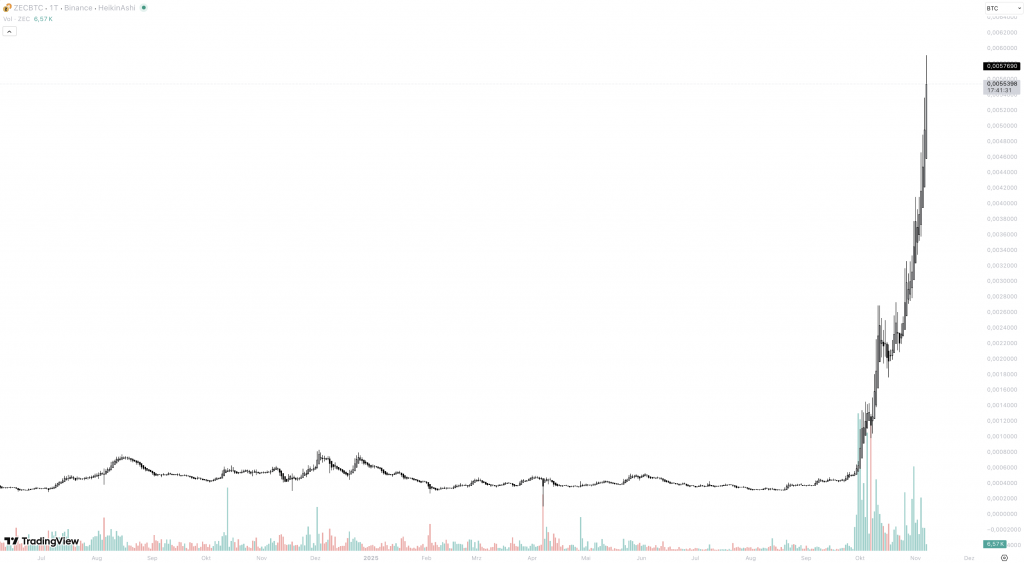 Der folgende Chart ZEC/BTC offenbart genau diese klare Stärke aktuell gegen Bitcoin: