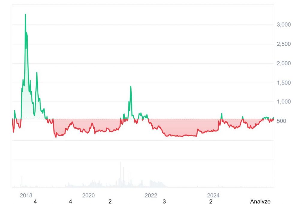 Das schafft laut Analysten wie Eliz Potenzial für eine größere Rallye. Sollte den Bullen auch der Ausbruch über die historisch hochrelevante 600-Dollar-Marke gelingen, würde das gute Chancen auf die größte BCH-Rallye seit 2021 eröffnen. Bei der 600-Dollar-Marke ist mit heftigem Widerstand und starkem Verkaufsdruck zu rechnen, da viele Anleger dieses Kursniveau genutzt haben dürften, um Verkaufsorders zu platzieren.