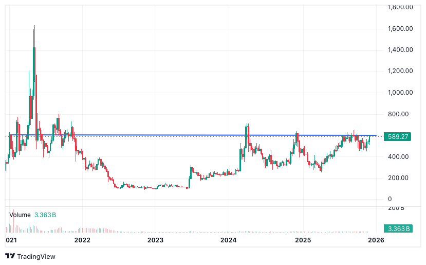 Es folgte im November 2024 noch einmal eine Rallye auf 634 Dollar und im September 2025 ein Aufschwung auf 648 Dollar. Dabei war es den Bullen jedoch nie gelungen, den Kurs länger über dem wichtigen 600-Dollar-Widerstand zu halten. Seit September zeigt sich BCH jedoch überraschend resilient gegenüber dem Abschwung des restlichen Krypto-Marktes. Zwar kam es auch hier zu einem kurzzeitigen Rückfall unter die 500-Dollar-Marke, doch die Verluste wurden schnell wieder aufgekauft.