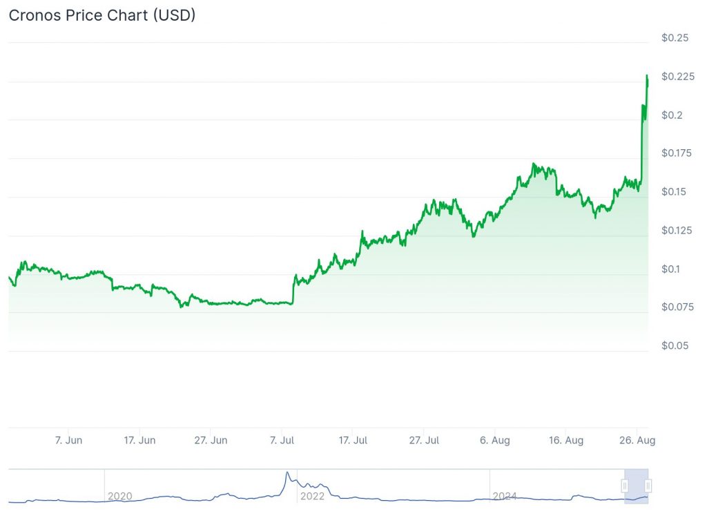 Für die Ursachen des heutigen Kurssprungs gibt es keine eindeutig identifizierbare Erklärung. Allerdings dürften einige Faktoren positiv zusammengewirkt haben. Zum einen gab es im Cronos-Ökosystem bereits vor rund einem Monat das Netzwerk-Upgrade auf Cronos POS V6. Das Upgrade führte das Cosmos SDK V0.50.10 ein, um Transaktionen deutlich zu beschleunigen und zahlreiche weitere Vorteile für das Cronos-Mainnet mit sich zu bringen.