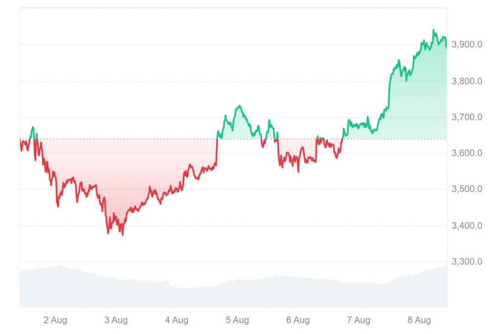 Der Kurs von BTC liegt wieder bei 117.000 $. Deutlich stärker ging es für ETH aufwärts. Von einem gestrigen Preis bei 3700 $ kletterte der ETH-Kurs über die 3900-$-Marke auf ein bisheriges Tageshoch von 3952 $. Das entspricht einem Tagesplus von 5,53 %.