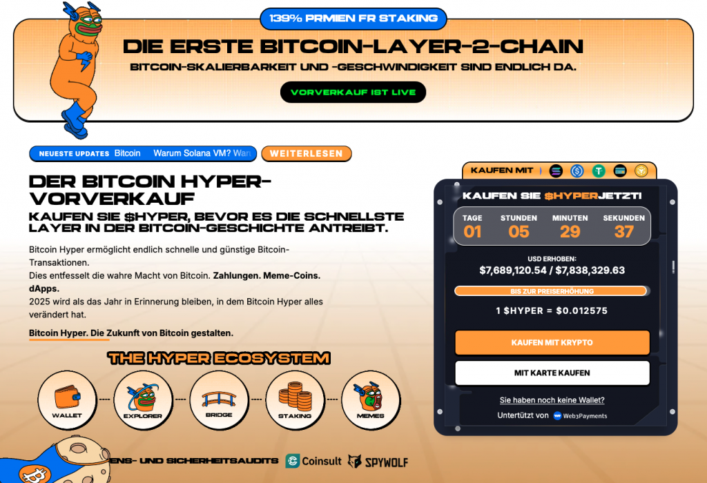 Hier flossen inzwischen bereits über 7,6 Millionen $ an Funding von Investoren zusammen. Der Kurs pro Coin liegt aktuell noch bei 0,012575 $ und im Presale erworbene HYPER Tokens können im Anschluss für eine jährliche Rendite von bis zu 139 % gestaked werden.